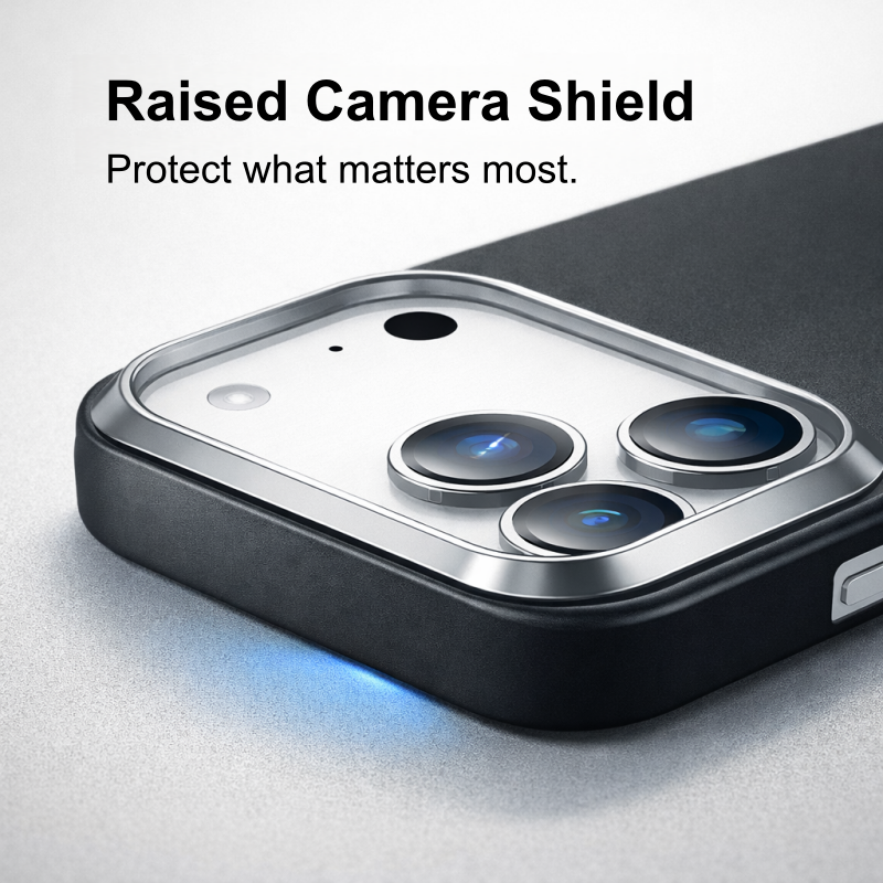 The reinforced camera bezel is elevated above the lenses to prevent scratches, impacts, and daily wear.