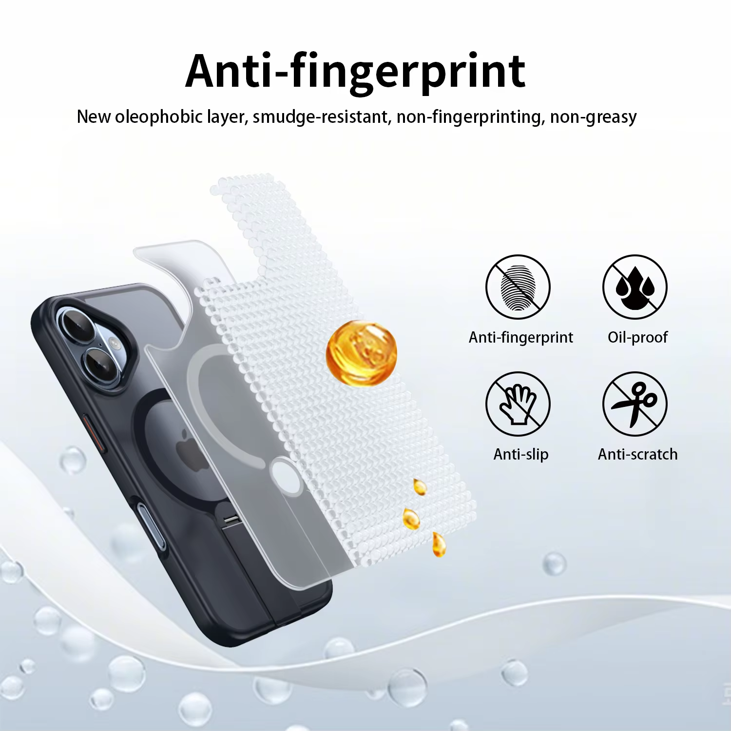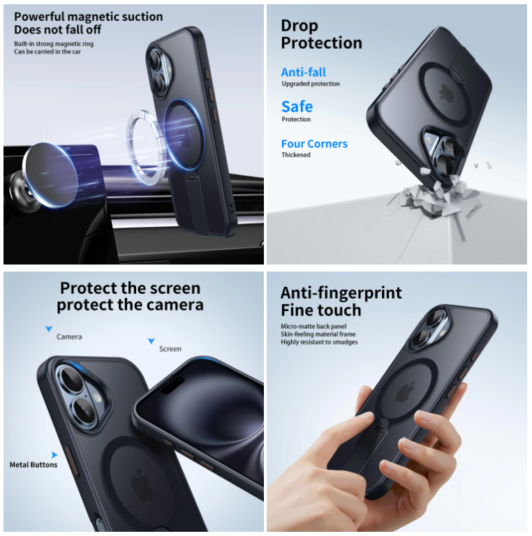 Crafted from flexible TPU and durable PC for shock absorption and scratch resistance, with a magnetic ring for MagSafe compatibility and a metal bracket for added strength. All-around protection in one sleek design.
